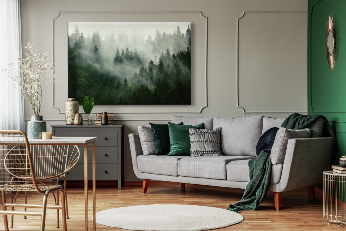Hast du eine große freie Wand, wie hier im Beispiel links über der Couch, kannst du diese zum Highlight deines Zimmers machen, dafür braucht es nur ein Bild und nichts weiter dazu.