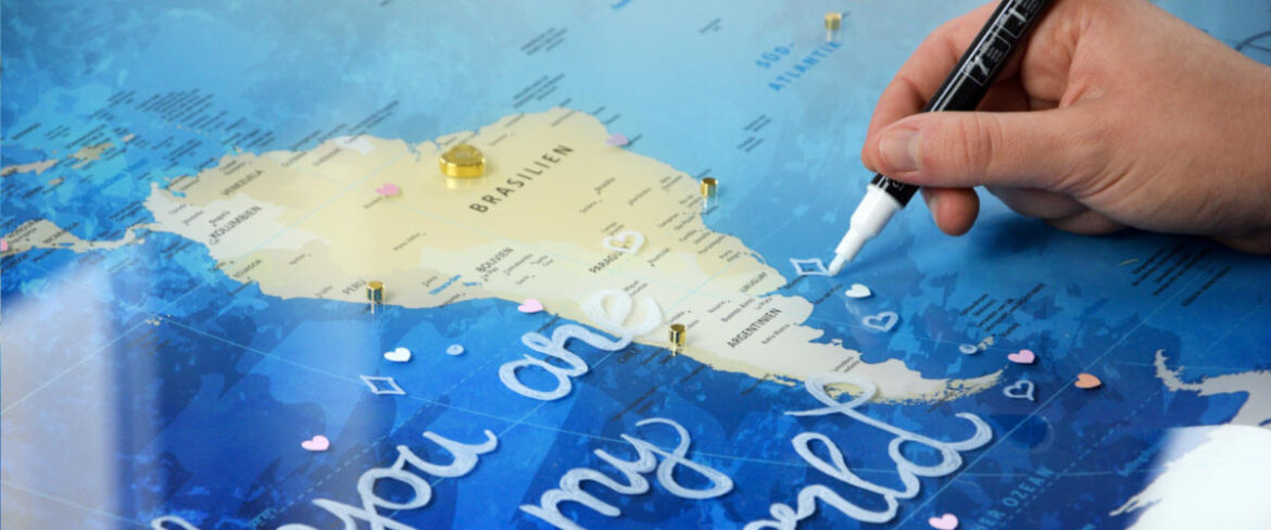 Mit einem Kreidestift kannst du auf alles schreiben und malen, egal ob du eine Weltkarte als Glasbild, Leinwandbild oder Poster hast. Sie funktionieren auf allen Varianten unserer magnetischen Weltkarten. Probier es aus, es schafft die den absoluten gestalterischen Freiraum und lässt sich jederzeit, bei Bedarf, wegwischen. Zeichne Flugrouten, Reiseziele und besondere Orte ein, die dir wichtig sind. Halte alle wichtigen Momente detailgetreu fest, die du erlebt hast.